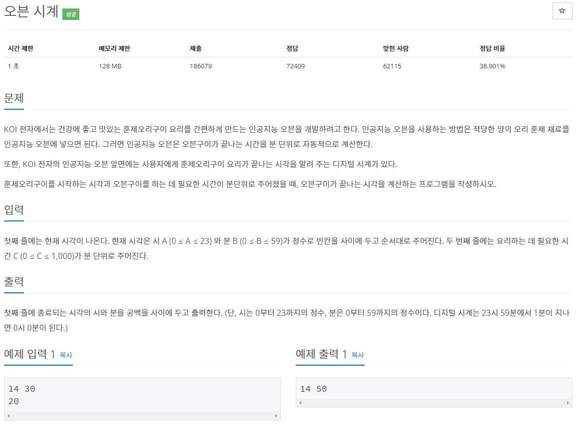 아이디어는 입력받는 현재시각을 분으로 만들어서 요리하는 데 필요한 시간을 더하면 된다.